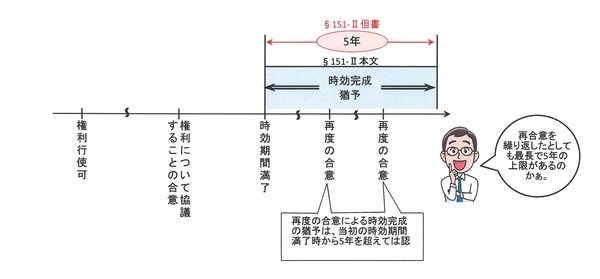 当事者は、上記合意によって時効の完成が猶予されている間に、再度の合意によって時効の完成をさらに猶予することができますが(§151-Ⅱ)、初回の合意によって時効の完成が猶予されていなかったとすれば時効期間が満了すべきときから通じて5年を超えることはできないものとされています(§151-Ⅱ但書き)。つまり、催告の場合と異なり、合意を繰り返して時効の完成を猶予し続けることが認められていますが、これも無制限ではなく、最大5年間に限られることになります。
