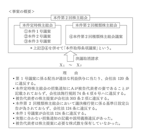 これに対し、X1が、本件第2回株主総会における全部取得条項付種類株式制度を利用したスクイズアウトを可決する旨の決議の取消しと、本件定時株主総会におけるAを社外取締役に選任する旨の決議の取消を求め、X2ないしX7が、本件第2回株主総会における決議の全部の取消しを求め、訴えを提起した。